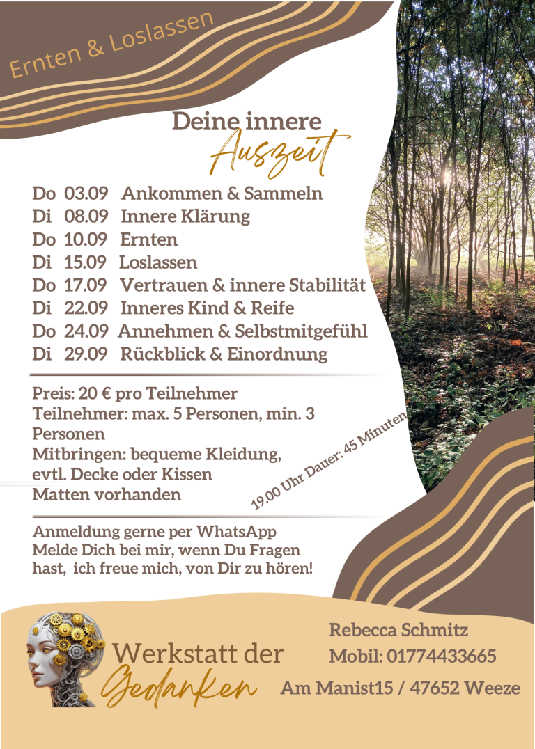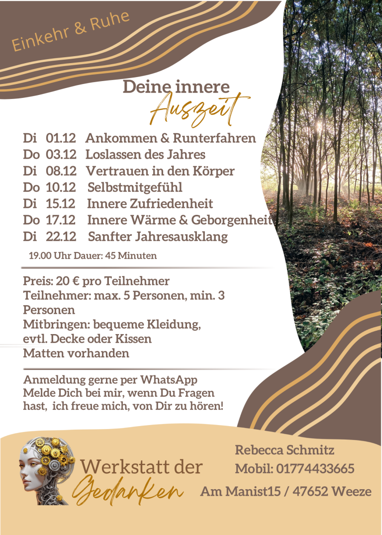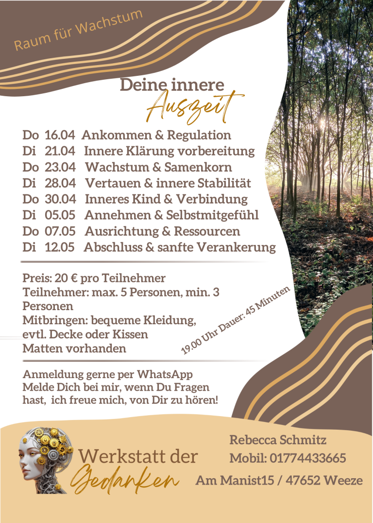 Alle Termine finden in Kleingruppen statt und bieten dir einen geschützten Rahmen, um zur Ruhe zu kommen, loszulassen und dir bewusst eine Auszeit zu schenken.